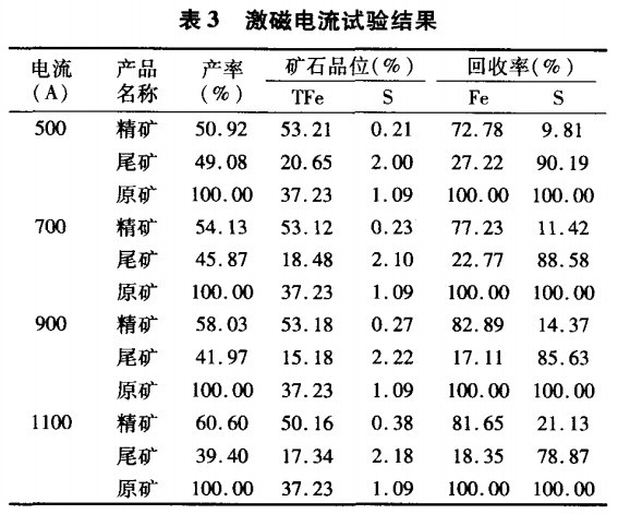 從表3結(jié)果可見,激磁電流從500A增加到900A時,精礦鐵品位和回收率都隨之增加,硫的品位降低。但當(dāng)激磁電流達(dá)到900A以后,繼續(xù)增大激磁電流。鐵精礦回收率增加,但品位卻隨之下降,而且鐵精礦中硫的品位大于0.3%,所以綜合考慮,選礦試驗采用900A比較合適。